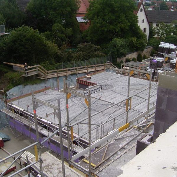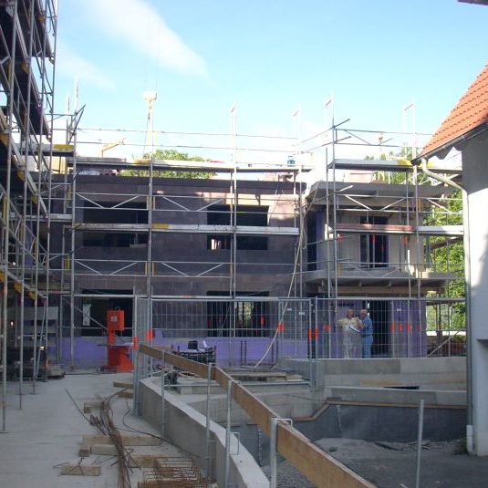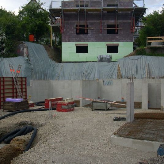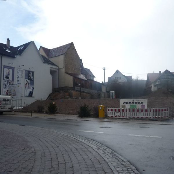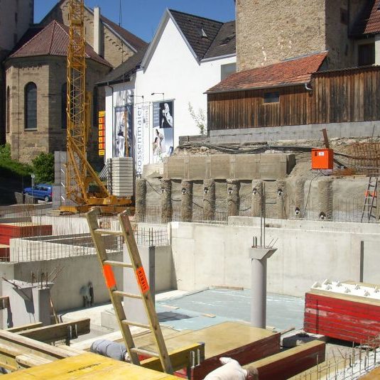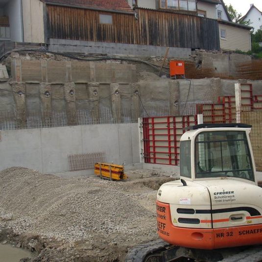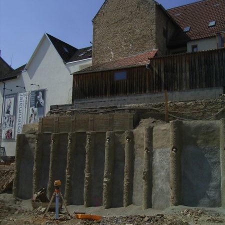 Abfangung der Nachbarbebauung durch eine Bohrpfahlwand.
